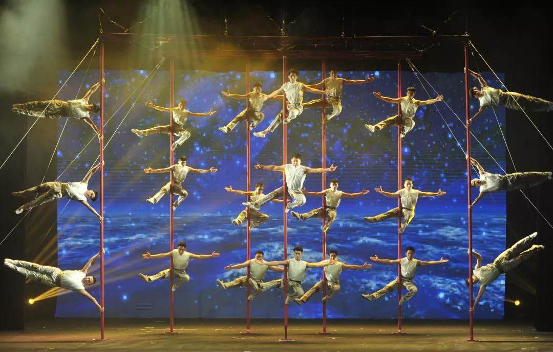 “疊羅漢”“大排樓倒”“轎子對拋”等武術(shù)節(jié)目,結(jié)合“前空翻一周半夾桿”“轉(zhuǎn)體720度夾桿”等一連串爬桿技巧動作。