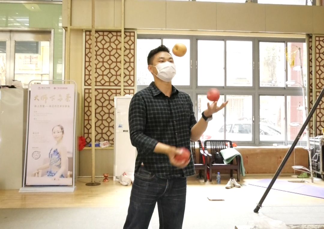雜技演員金帥給網(wǎng)友們帶來(lái)隨時(shí)能練的“宅家技能”,3個(gè)蘋(píng)果輪流拋接,鍛煉靈活手技。