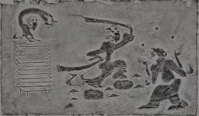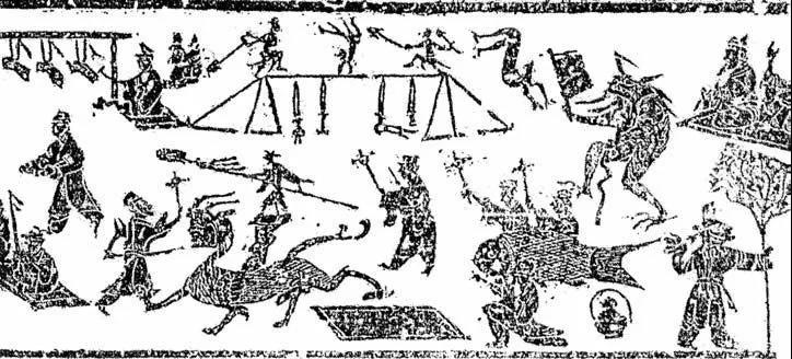 中國雜技發(fā)展到漢代,內(nèi)容更充實(shí),品種更豐富,技藝更高超。到東漢時(shí),則形成了一種以雜技藝術(shù)為中心,匯集各種表演藝術(shù)于一堂的新品種——“百戲”體系。例如:1954年在山東省沂南縣的北寨村,發(fā)掘了一座漢代古墓,在一幅巨型的畫壁上雕刻著當(dāng)時(shí)的樂舞百戲,非?,F(xiàn)實(shí)生動。這幅圖從左到右分為四部分:“跳丸跳劍和戴竿”表演、樂隊(duì)表演、”走索拿頂和魚戲“表演、“馬戲和鼓車”表演,規(guī)模盛大。