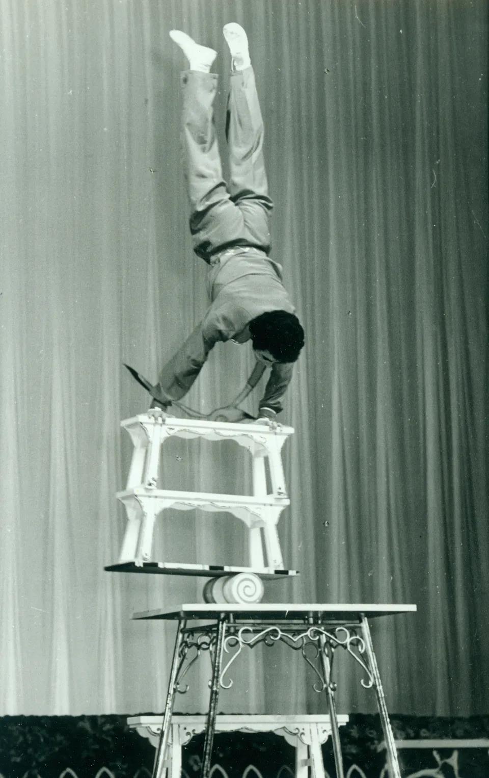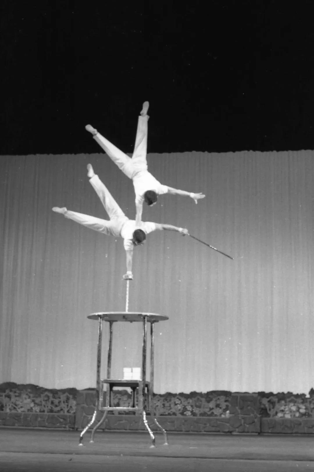 另一種倒立更多的是摻雜、揉和在其他雜技節(jié)目中運(yùn)用,如在走繩、爬竿、柔術(shù)等節(jié)目中畫龍點(diǎn)睛,用倒立把節(jié)目推向高潮。