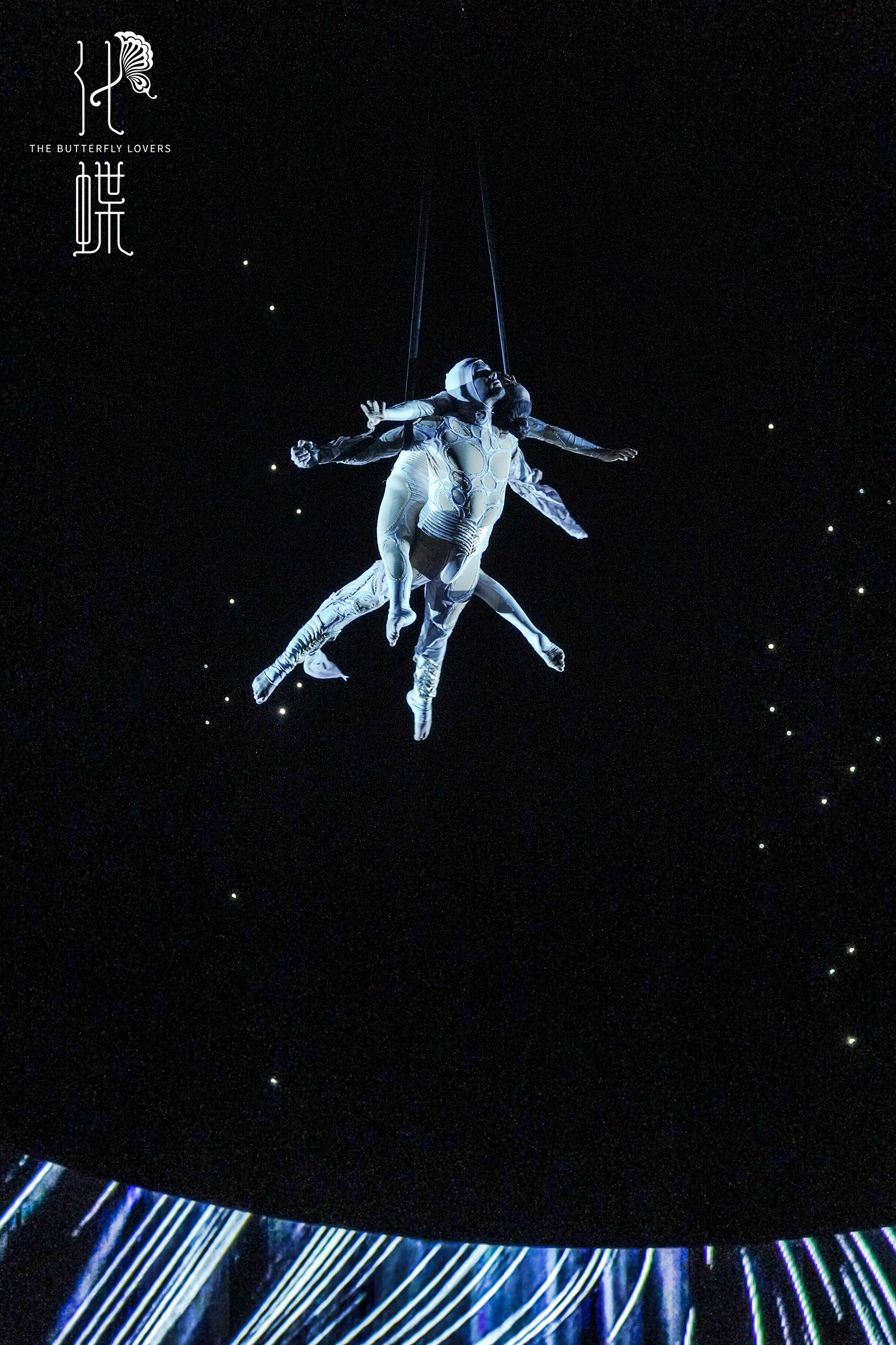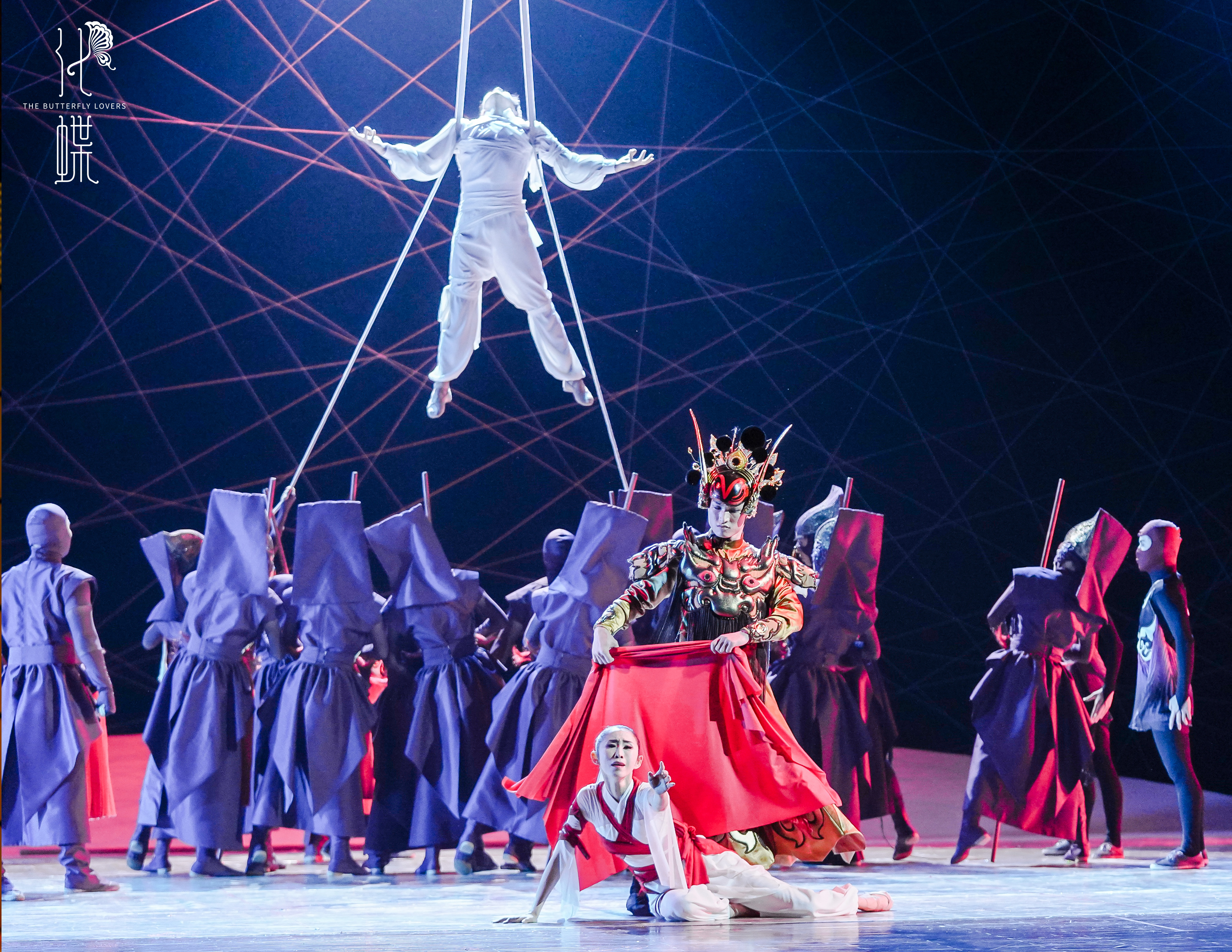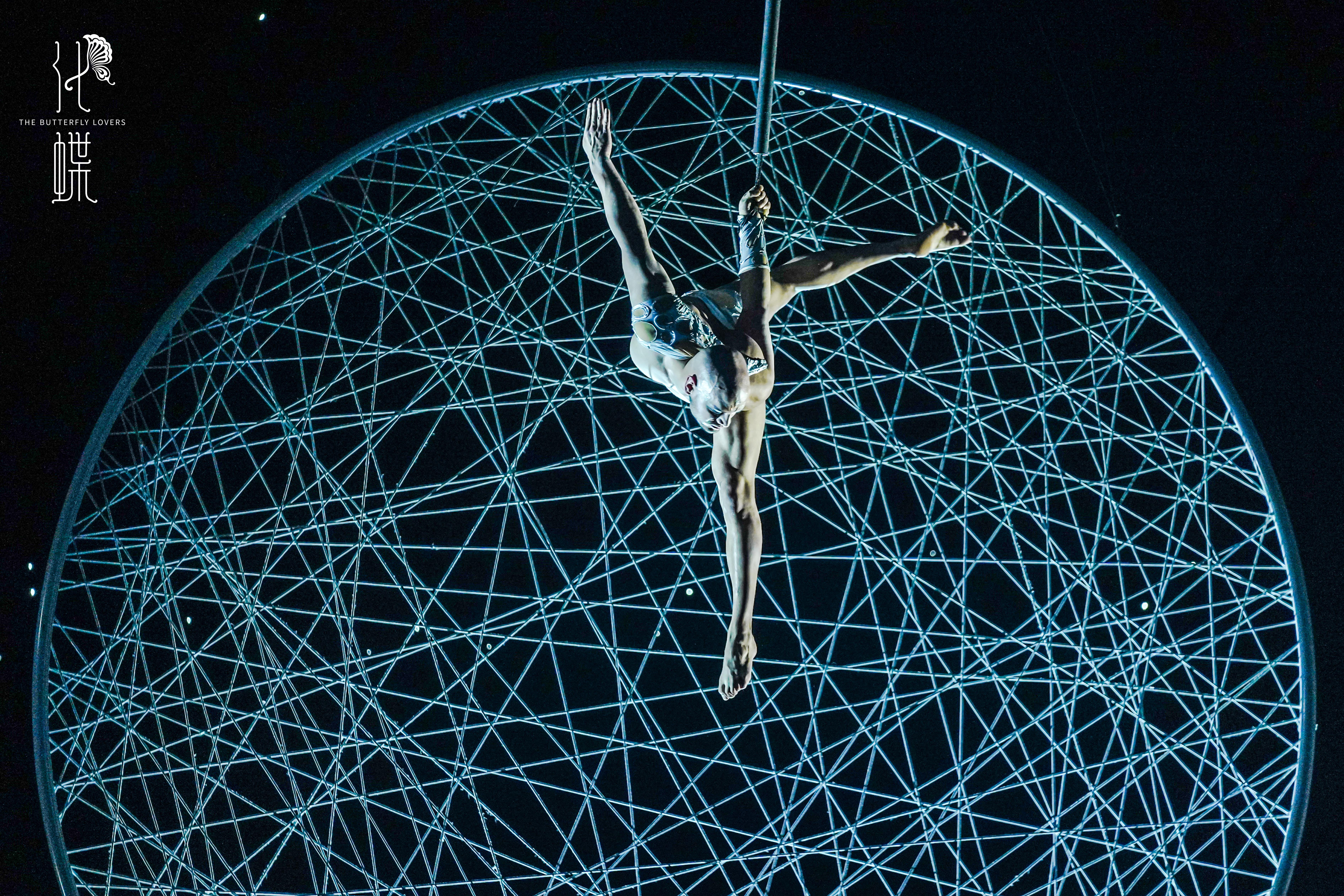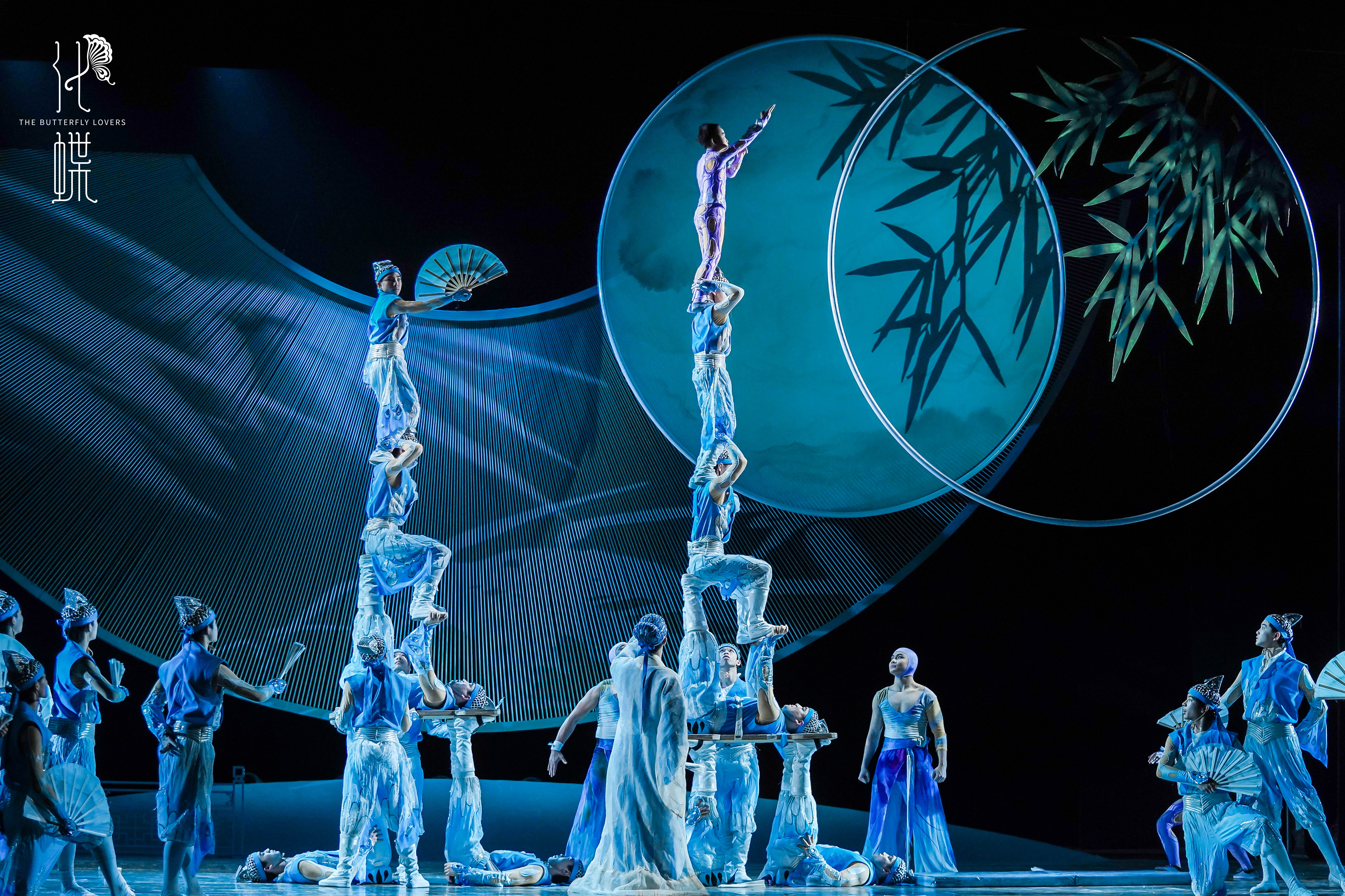 《化·蝶》情節(jié)飽滿,內(nèi)涵豐富,第一幕中梁山伯、祝英臺的出場和相識,皆編排了大量群體節(jié)目。演員們化作一只只栩栩如生的彩蝶,伴隨靈動輕快的音樂,與大氣典雅的舞美意像相配合,通過空竹、軟功、蹬人、蹬傘、球技等數(shù)十種雜技節(jié)目的創(chuàng)新表演,展現(xiàn)閨閣中、書院里的少女柔情、少年爽朗。