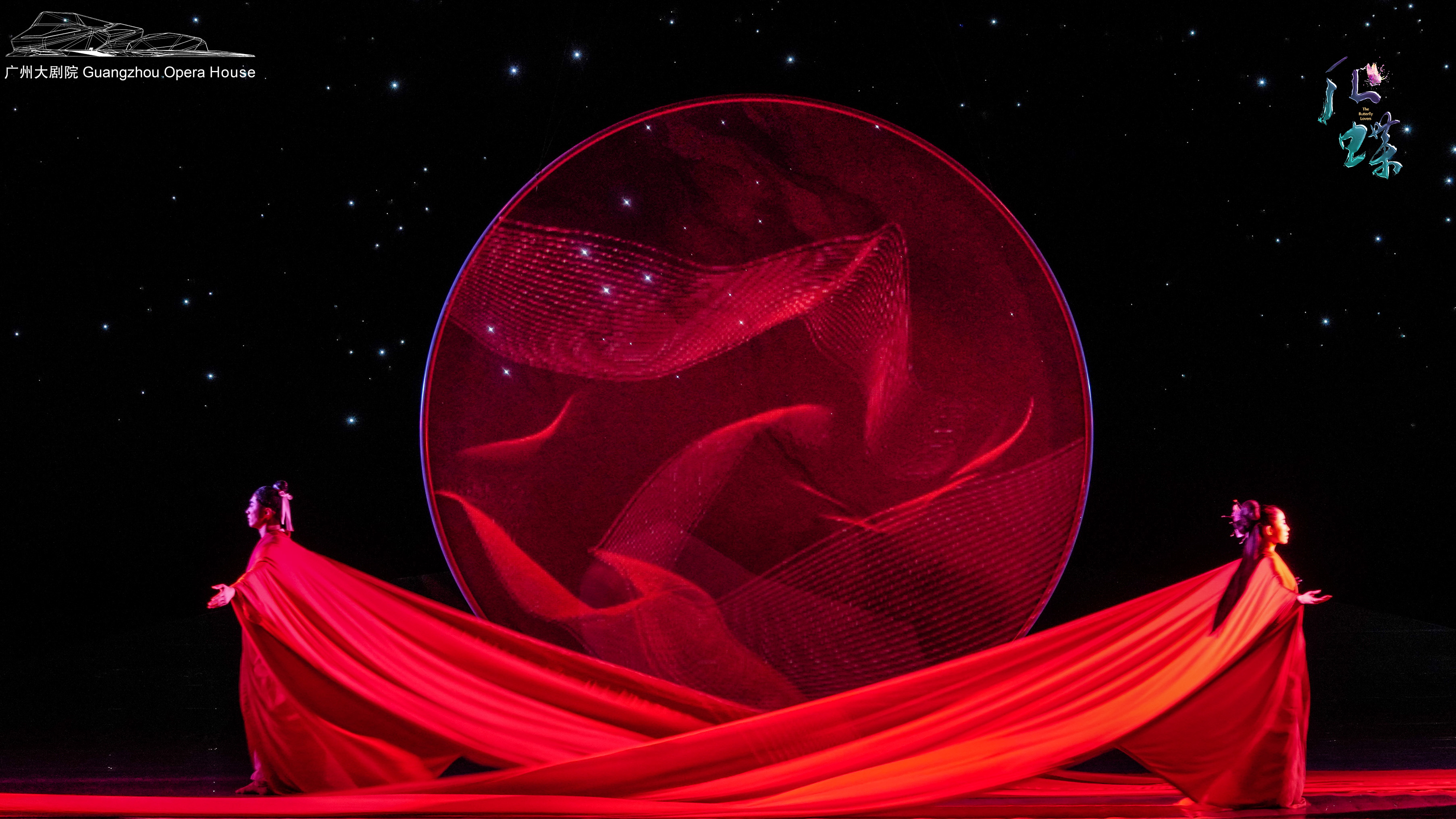 因此,該劇以《蝶生》拉開(kāi)了“序幕”。舞臺(tái)上空是一個(gè)如朗月般懸掛的“圓”,只是它宛如被橫七豎八的“絲”縛住的“繡匾”——但它其實(shí)是主創(chuàng)們想深深給我們烙下的“繭”的意象……在這個(gè)“繭”的前景上,是一個(gè)由“綢吊”延伸開(kāi)來(lái)的表演,一名健碩的藝者在與“綢吊”的糾纏中表現(xiàn)掙脫束縛、破繭而出的力量……當(dāng)藝者和“繭”降至臺(tái)面。