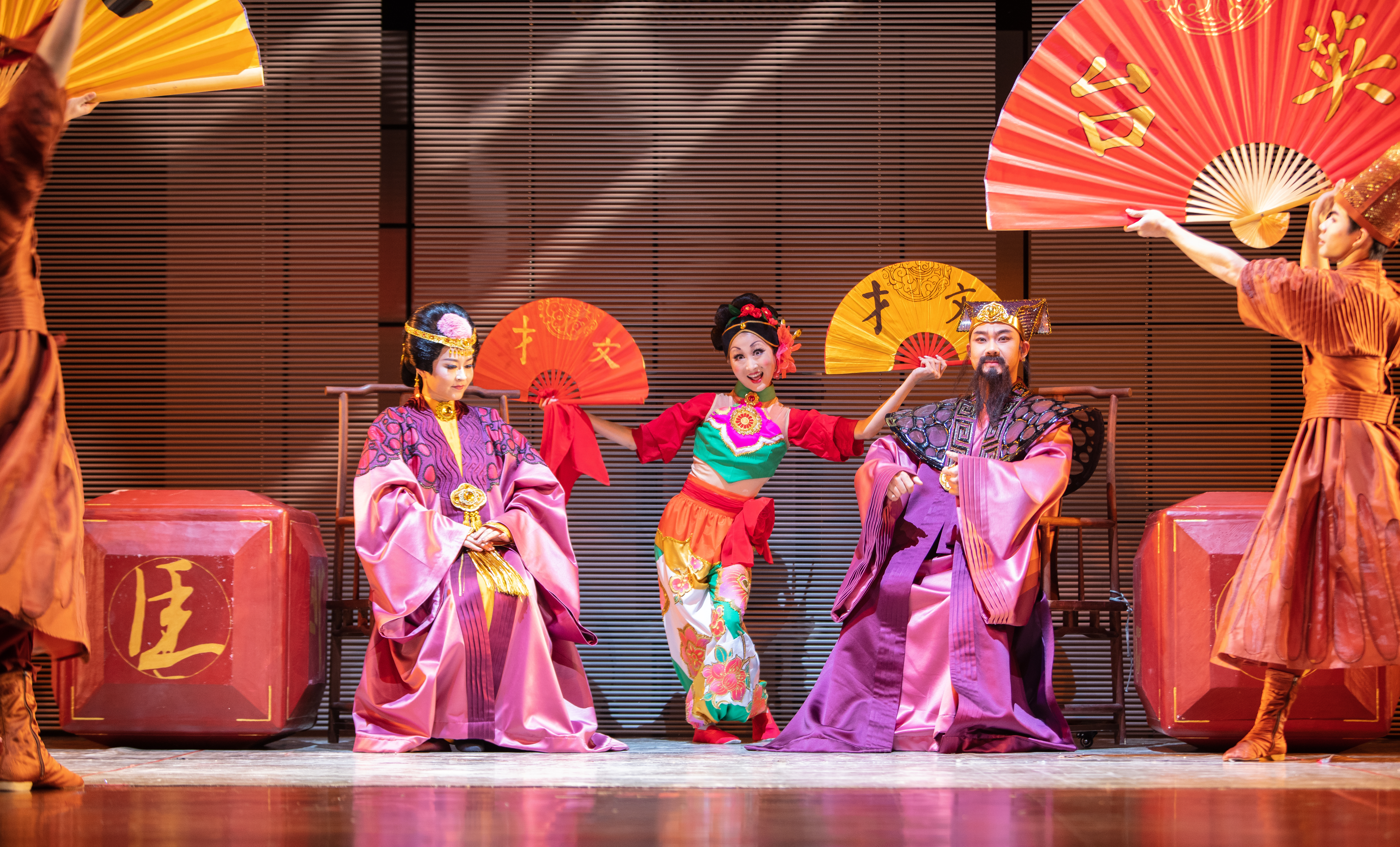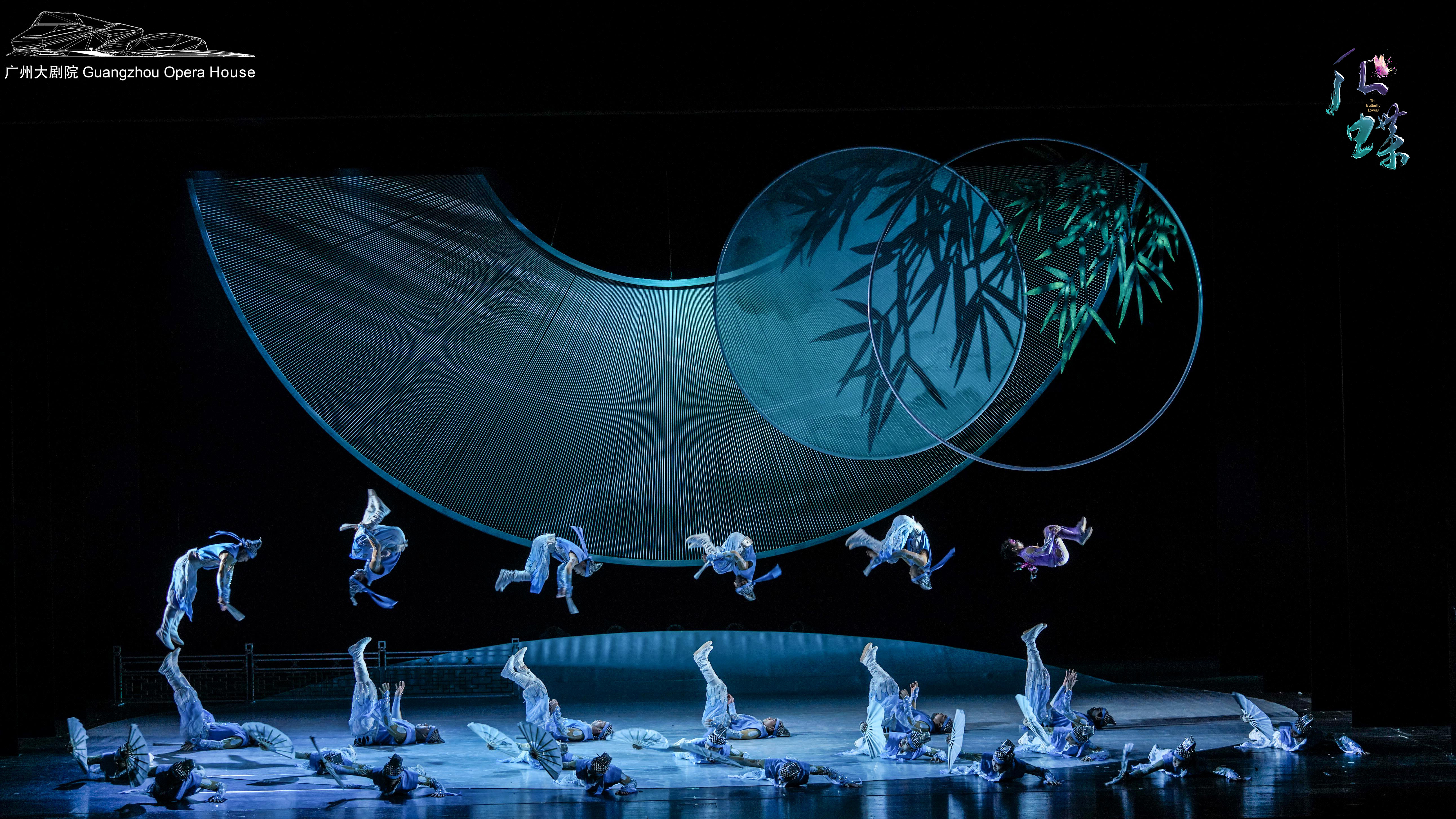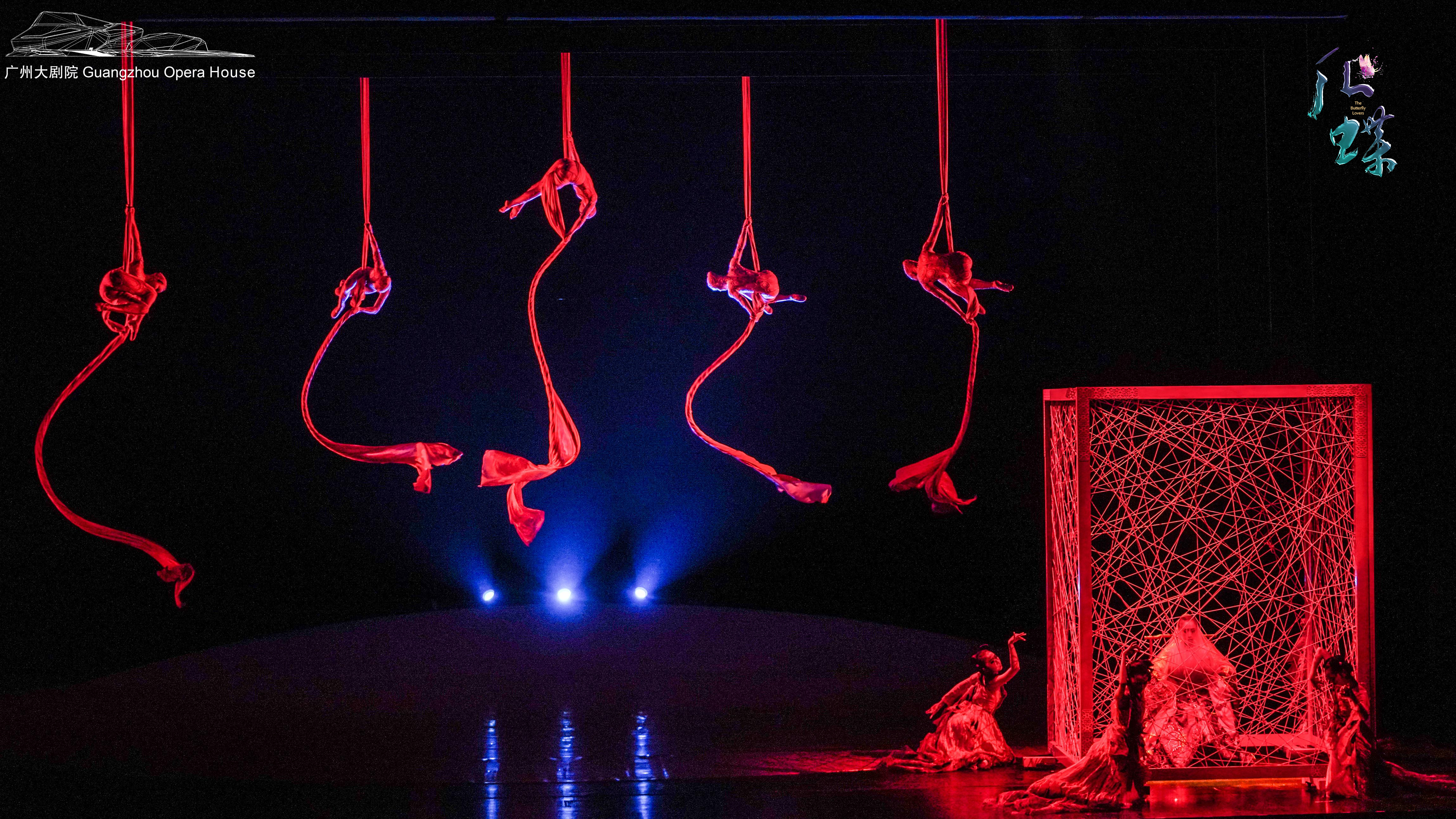 也就是說(shuō),在該劇十個(gè)場(chǎng)次的構(gòu)成中,將整個(gè)故事切分為十個(gè)事象相對(duì)獨(dú)立且互相關(guān)聯(lián)的情境——每一情境都有一個(gè)核心事象,而各場(chǎng)的場(chǎng)名就是這一事象的凝練提示;同時(shí)每一情境又用一個(gè)雜技科目作為基本表現(xiàn)手段,如同舞蹈編創(chuàng)中所設(shè)定的“主題動(dòng)機(jī)”,使這一“基本手段”在表現(xiàn)“核心事象”時(shí)也呈現(xiàn)出自身的精彩技藝和美感效果:比如一幕二場(chǎng)《共讀》中的“蹬人”科目,一幕三場(chǎng)的《情生》中的“抖空竹”科目,一幕五場(chǎng)《情別》中的“耍傘”科目,二幕一場(chǎng)《抗婚》中的“綢吊”科目,二幕五場(chǎng)《化蝶》中的“肩上芭蕾”科目……都是如此。